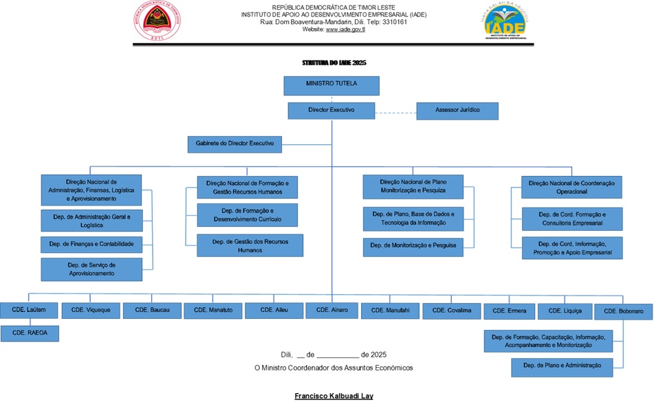 The Institute for Business Development Support (IADE) is a public institution indirectly dependent on the State. Its offices are located in 13 municipalities, with administrative, financial and patrimonial autonomy. IADE monitors government policies in the area of training, qualification of national micro, small and medium-sized companies and cooperatives for the management of viable business activities, the sustainability of the problems faced by entrepreneurs, whether individually or collectively, thus promoting business development throughout the territory.